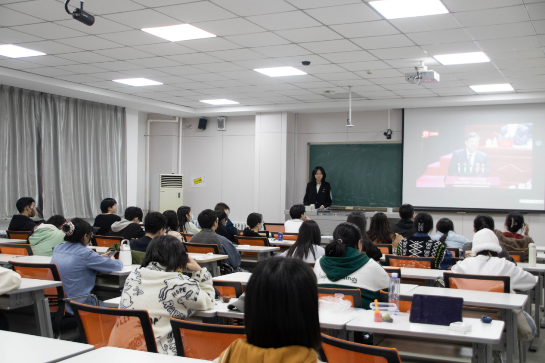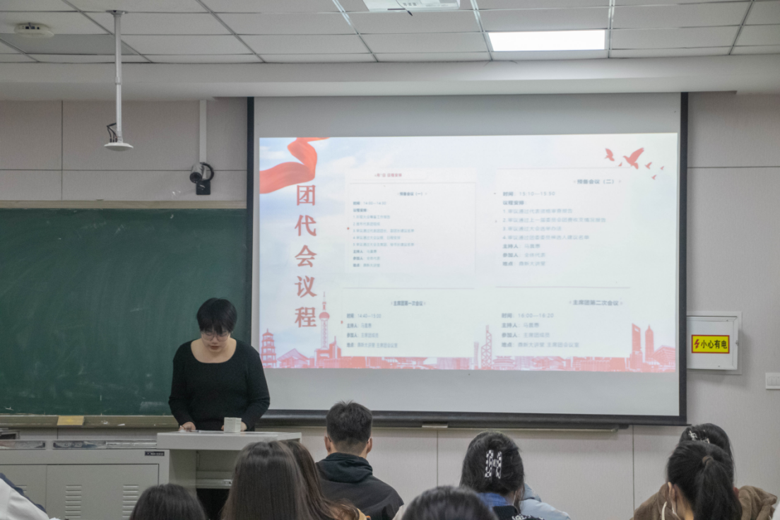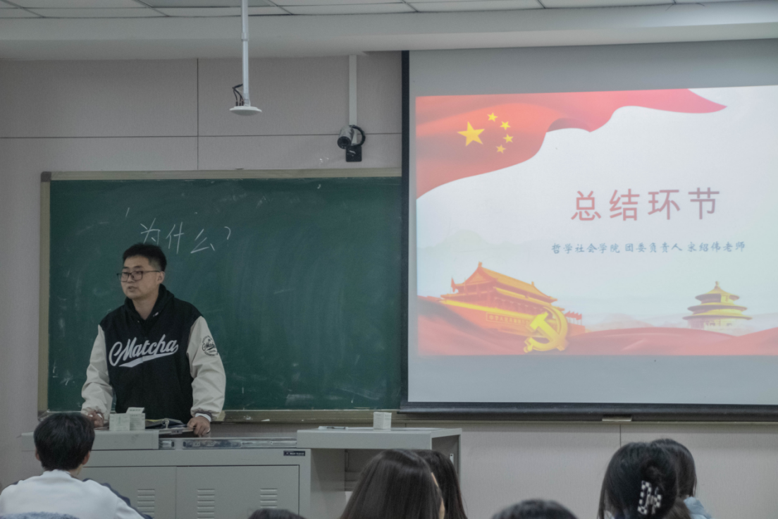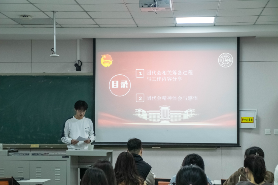 团委负责人宋绍伟老师向同学们进行心得分享和总结。宋老师从本次团代会的主题出发,结合党史团史,从“为什么”“做什么”“怎么做”三个角度切入提到,作为青年学子,我们务必坚持用习近平新时代中国特色社会主义思想铸魂强基,坚定不移听党话,矢志不渝跟党走;正确认识党领导中国人民过去五年工作和新时代十年伟大变革,赓续“党旗所指就是团旗所向”的光荣优良传统,将砥砺奋斗融入日常、化作经常,在新时代创造出不负青春、不负人民的贡献。