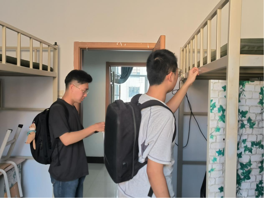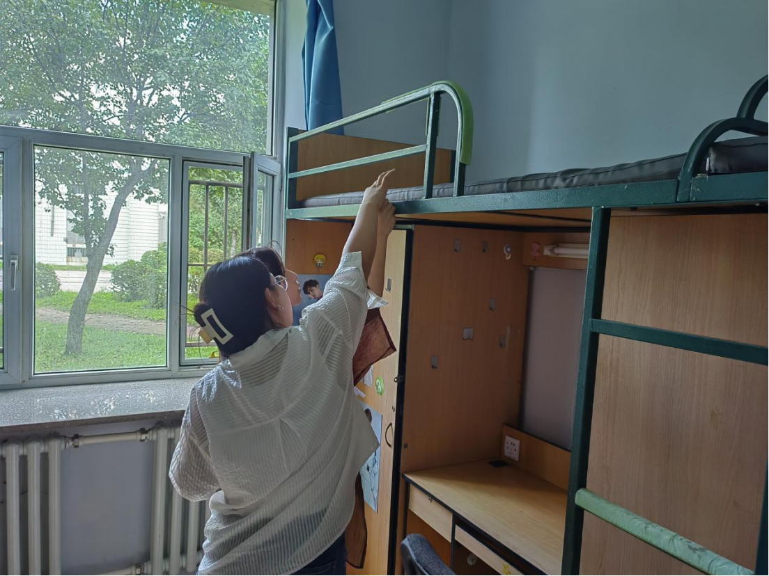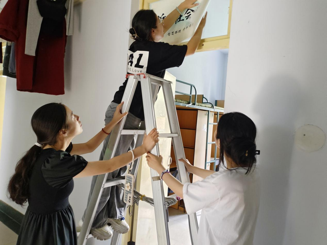 标识和学生住宿标识认真张贴,仔细检查了寝室硬件设施,发现问题向宿舍管理人员及时求助解决。同时,师生们利用已有的清扫工具对新同学们的宿舍进行了打扫整理,为新同学营造卫生干净的住宿环境。