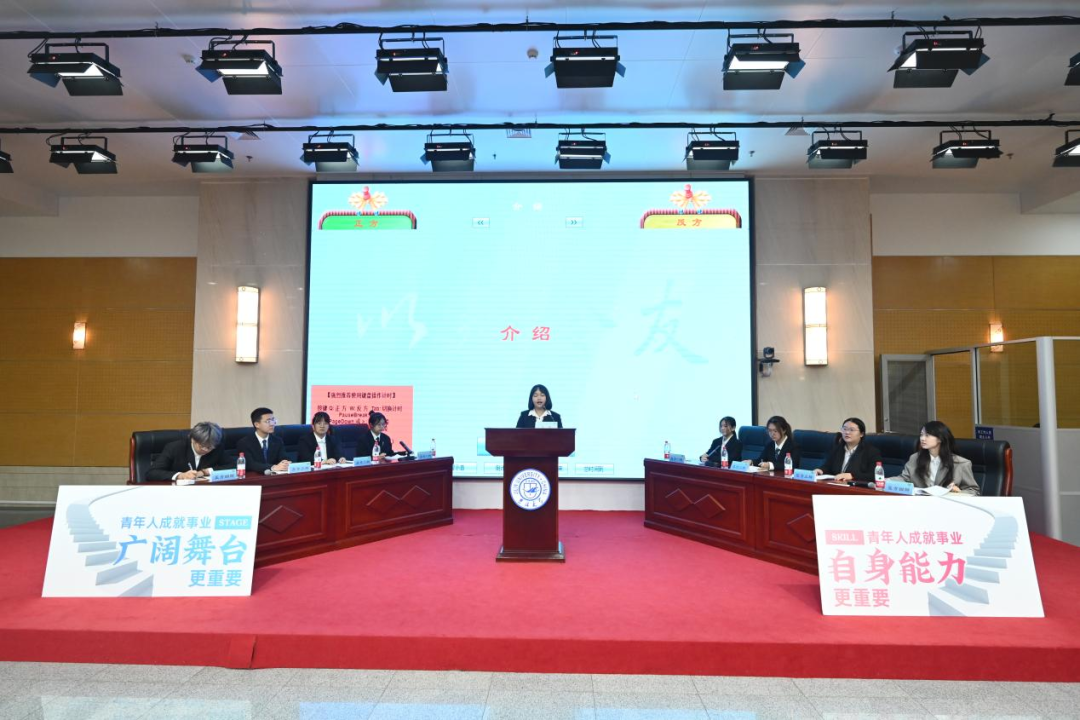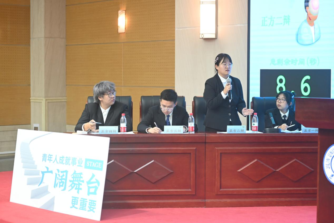决赛中,双方辩手紧紧围绕“青年人成就事业广阔舞台/自身能力更重要”这一辩题展开了深入辩论。成就一番壮丽的事业,青年人是要等待广阔舞台再款款上场,还是努力提升自身能力以拼搏获取事业成功的一线曙光?正反双方根据各自的立论,引经据典,各抒己见。你来我往之间,针锋相对,弘扬道理,不断迸发出语言的智慧与思想的火花。面对双方辩手金句频出、妙语连珠,全场观众掌声连连,全场氛围热烈浓厚。