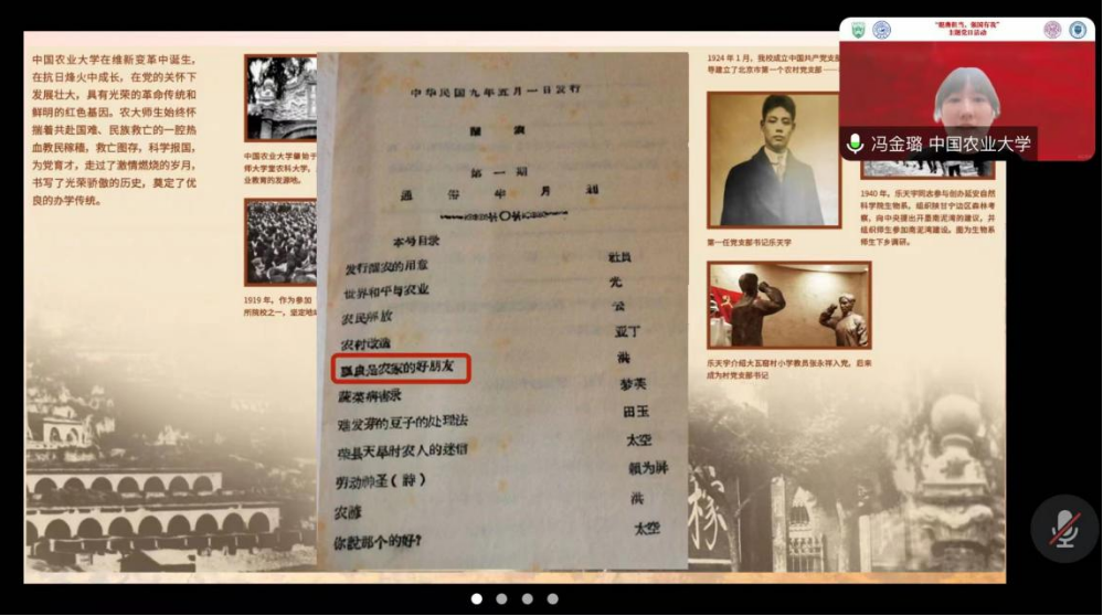 2020级本科生李慧婷主持,中国农业大学党委理论学习宣讲团博士分团第四届团长、第五届党支部书记冯金璐进行理论宣讲,来自三地四校的学生党员、共青团员们进行心得分享,极速飞艇