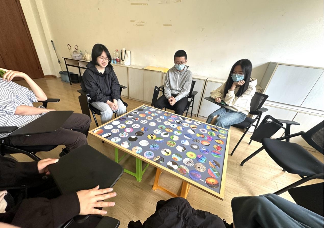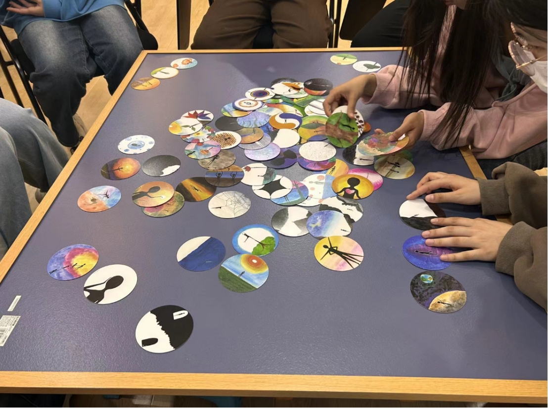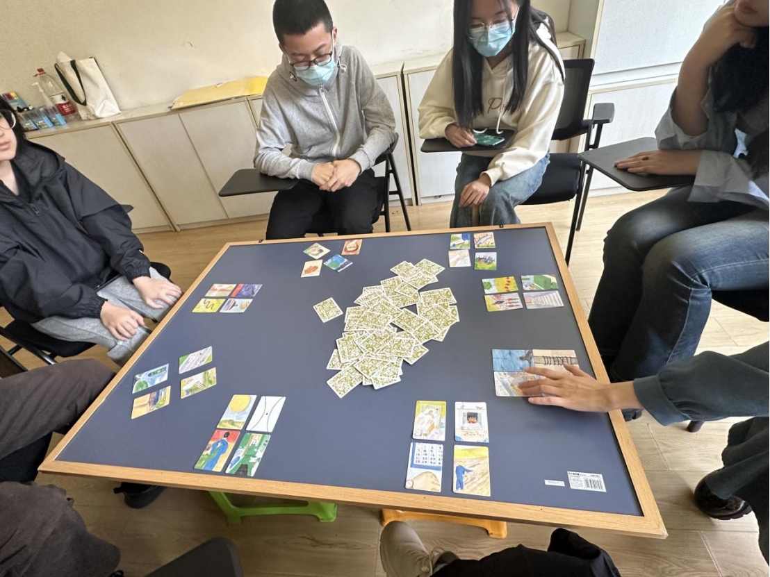 紧接着,朋辈辅导员带领大家进行第二个游戏环节—故事接龙。在这个环节中,大家依次翻开一张牌,按照牌面上的描述,讲出1-3句的内容,然后将牌放在桌子上,由下一位参与者继续讲述前一位参与者的内容,直到所有的图像卡都讲述完毕。这个环节让大家感受到了团队合作的重要性,同时也锻炼了大家的表达能力。在一片欢声笑语中,同学们创造出了一个个由大家一起描绘出的“主人公”的波澜壮阔的故事。这个虚拟的小小灵魂映射了每个人内心的一部分,引人深思。