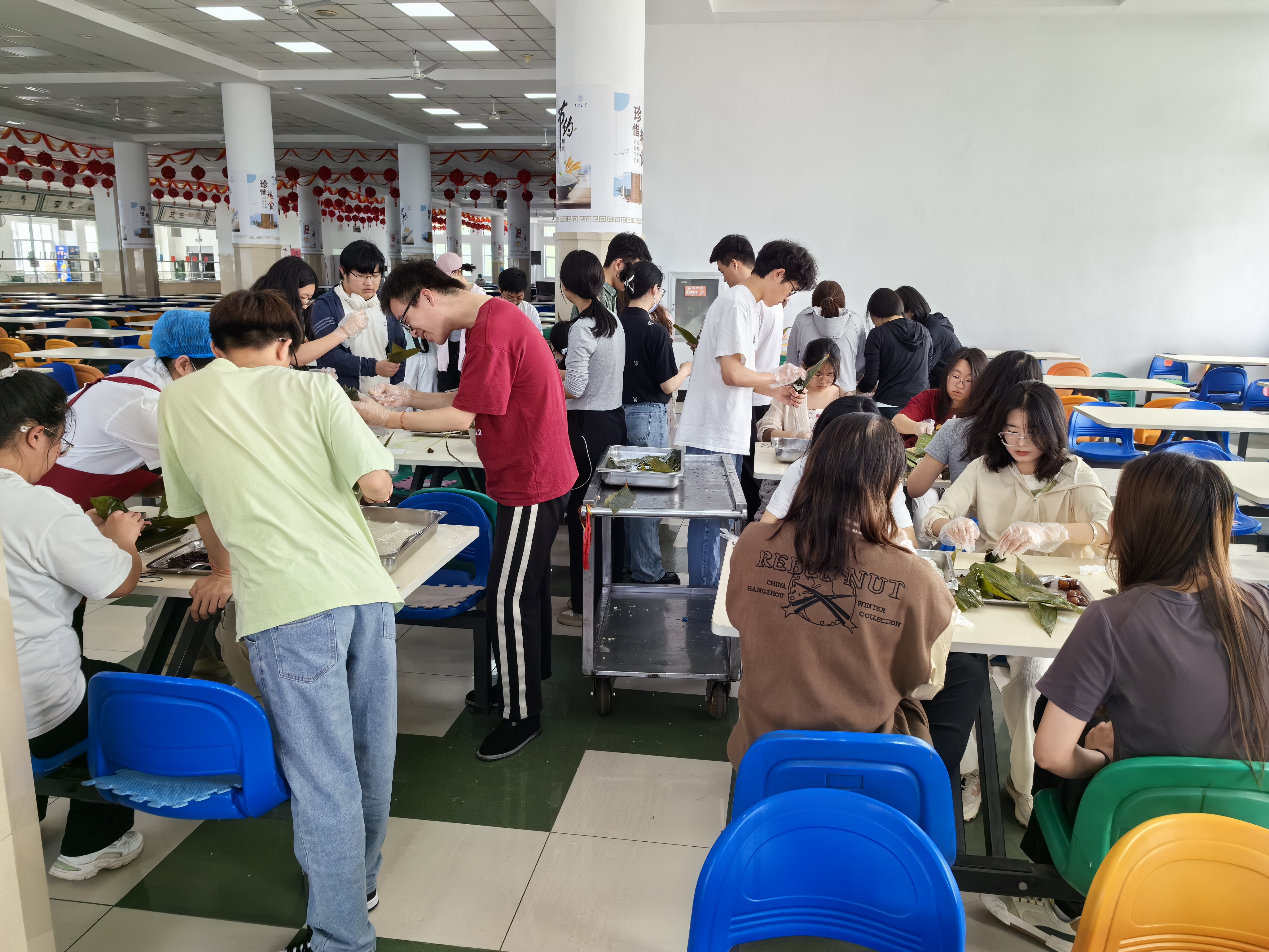 共庆端阳,互道安康。在活动进行阶段,同学们先在签到处领取了五彩绳和包粽子材料包,随后在食堂阿姨的指导下,开始了包粽子的实践。从食材的准备到粽子的包裹,食堂内热闹非凡,同学们积极参与,热情高涨。大家围坐在一起,相互交流包粽子的技巧和经验,欢声笑语不断。在食堂阿姨的耐心指导下,大家从不会包到逐渐掌握要领,成功包出一个个形状各异但心意满满的粽子。