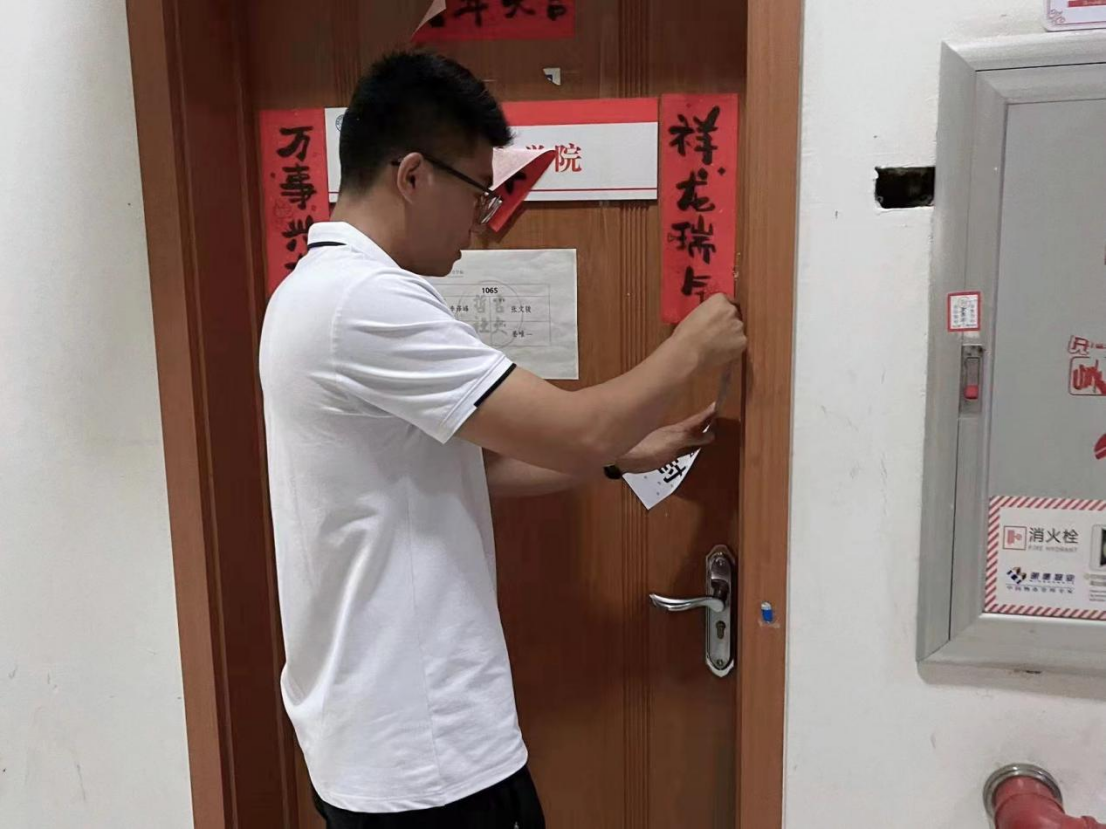 抵达学生公寓后,刘畅老师首先针对离校学生的寝室,进行了全面细致的消防安全隐患检查,并对检查中发现的潜在安全问题进行及时整改。随后,刘畅老师和张鑫鹏老师为离校学生的寝室粘贴了封条,进一步为离校学生营造安全可靠的寝室环境。