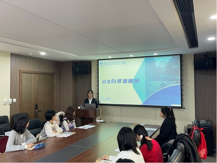 2024级本科生罗蔓茹同学以“纪念白求恩精神”为主题,带领同学们深入回顾了白求恩先生伟大而崇高的一生,向同学们生动展现了一位医术精湛、人格高尚的共产主义战士,一位不计个人得失、心怀大我、具有革命人道主义精神的理想主义者。同时,她号召同学们向白求恩先生学习,学习那种毫不利己、专门利人的无私奉献精神,学习那种对工作极端负责、对同志对人民极端热忱、对技术精益求精的共产主义精神,努力成长为一名白求恩式的医者、学者、奋斗者。