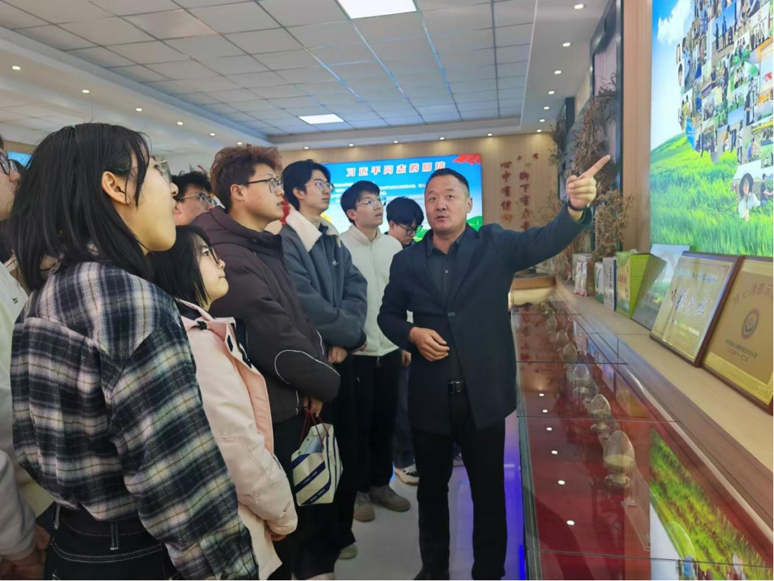 下午,在新洋丰现代农业有限公司总经理毕见超的讲解带领下,实践团参观了位于新洋丰总部一楼的乡村振兴展厅。通过实地观摩和讲解,团队成员对科技小院“六位一体”模式、现代农业科技应用以及农业产业化发展有了更深入的理解。团队依次参观了乡村振兴展厅中的玉米、大米、小米、绿豆粉条等特色农产品样品,切实感受了科技小院模式对于现代化农业生产的助益。通过调研,同学们也认识到:“酒香也怕巷子深”,好的产品是需要推广的,数商兴农通过推进产销一体化,让百姓收获到了切切实实的利益。