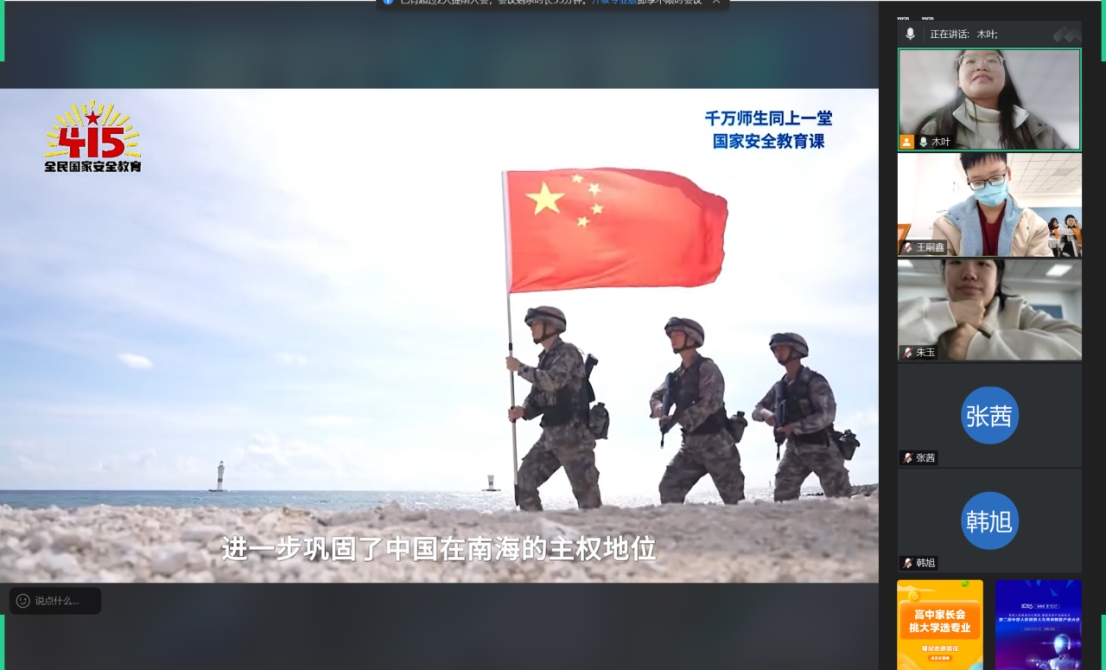 各团支部通过线上平台集体观看了《千万师生同上一堂国家安全教育课》主题公开课,系统学习了总体国家安全观的核心要义和十年来全民国家安全教育成果,深刻认识到我国国家安全形势面临的机遇和挑战,进一步增强忧患意识、树立底线思维。