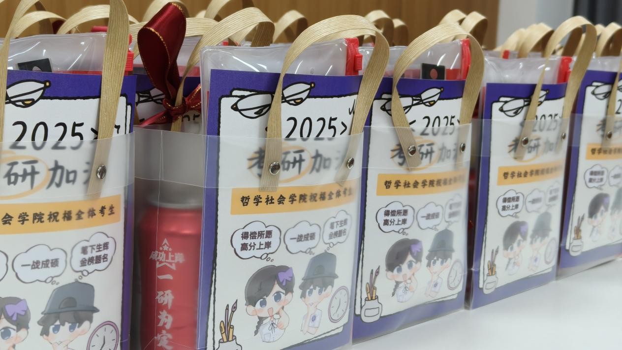 为大家制作的考研加油礼包,里面包含考试必备的文具套装等,同学们向老师们纷纷表示感谢,并将这份祝福和喜悦拍照留存和分享。