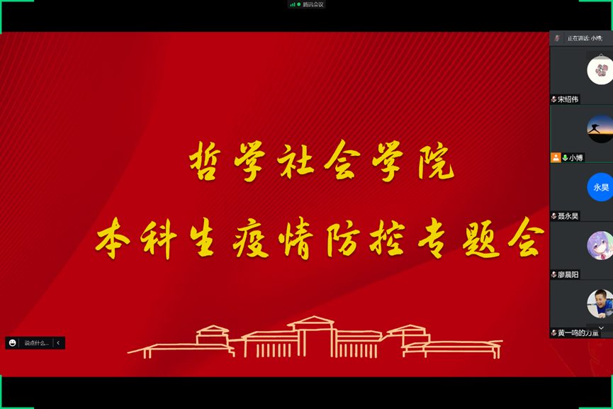 相关纪律安排;然后,于老师勉励各位学生党员要起到表率和监督作用,随时准备积极配合党组织的各项工作,切实把防疫任务贯彻落实好;最后,于老师再次提醒同学们要做好防护,非必要不要出寝室,多开窗户、多通风、多洗手、勤消毒,出门一定要戴口罩,放平心态、避免恐慌、科学防疫,对自己和同学的身体健康负责。
