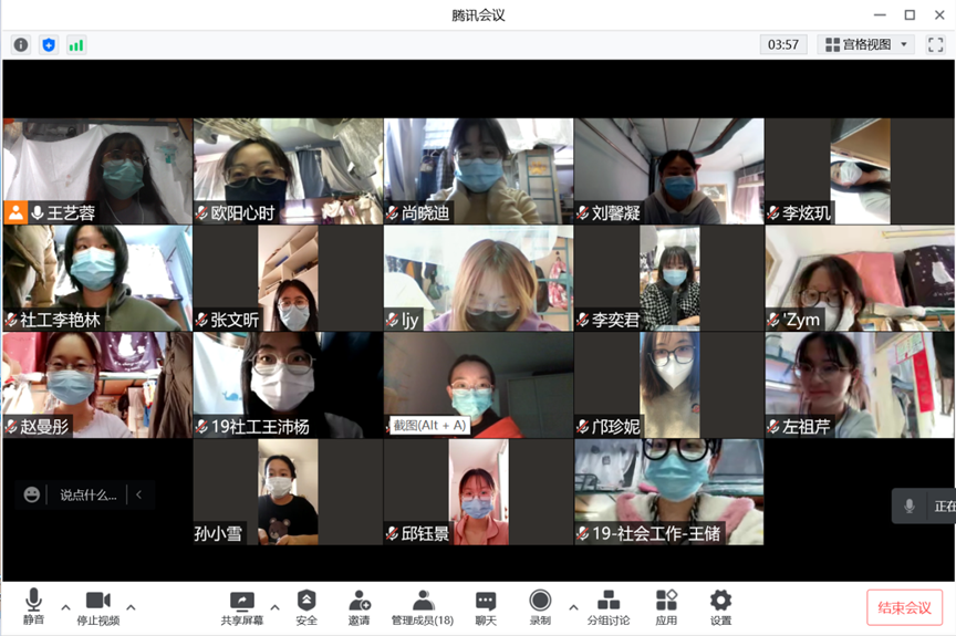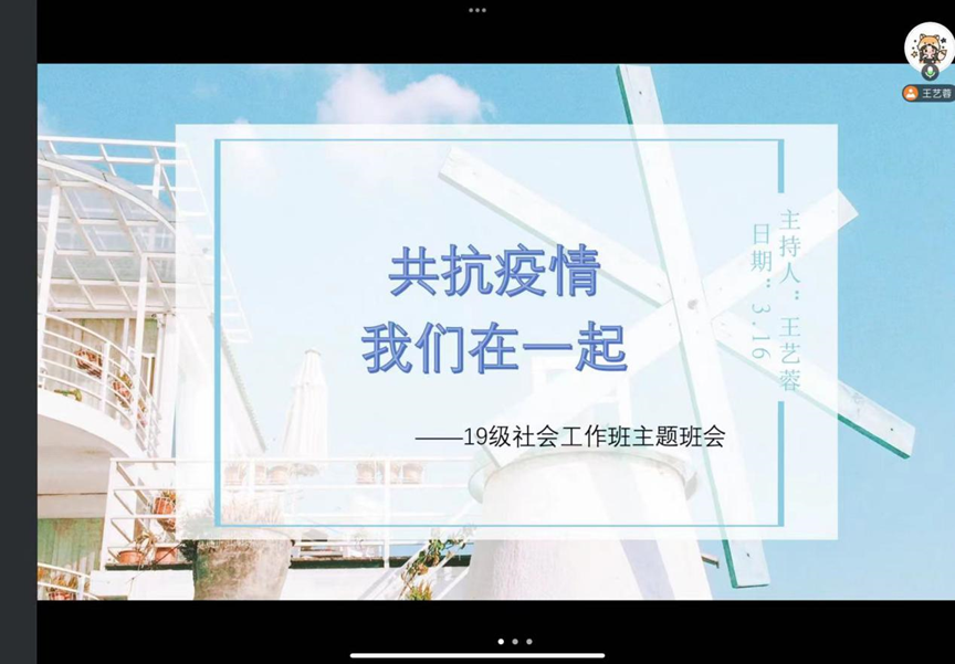 19级社会工作班开展了“共抗疫情,我们在一起”主题班会。班会主要内容为学习疫情防控政策与形式、适应线上教学方式、培养良好生活习惯三个部分,帮助大家更好了解疫情防控知识,保持良好心态,顺利度过封寝生活。班长王艺蓉和大家一起梳理了封寝以来的生活变化,回顾带给大家感动的一张张照片。接下来,付文颖同学向大家分享了适应线上教学方式和培养良好生活习惯的小建议。最后,班长王艺蓉再次强调疫情防控无小事,大家要遵守防疫要求,配合防疫举措,做好防疫措施,增强防疫能力,理想看待疫情,保持积极心态,大家终有一日能迎来春暖花开!