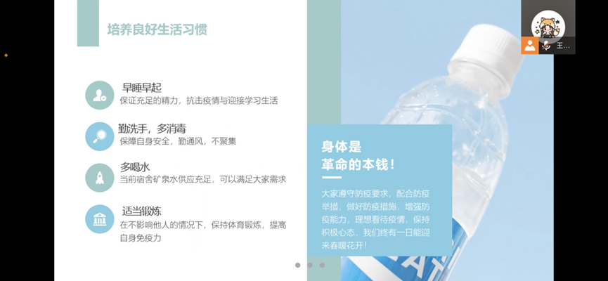 的志愿者榜样们,希望大家做好防护,党员要发挥先锋模范带头作用,做好表率,做好监督。部分同学向大家分享了在寝室的学习方法、心态变化等,班级凝聚力再一次被提高。我们坚信,疫情终将结束,向所有奋战在一线和幕后的疫情防控人员致敬!吉林终有吉临时,长春定复往常春!