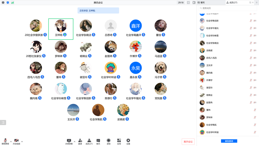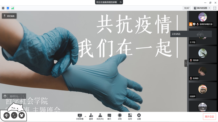 20级社会学班由王梓铭、曾辞源、仵博宇同学主持开展主题班会,王梓铭同学为同学们分析了当前面临的疫情形势,鼓励大家在做好防护措施的同时,积极加强锻炼、增强免疫力,保持积极向上的生活状态;曾辞源同学讲述了疫情下线上学习的要点,与老师积极沟通联系,以轻松认真的态度面对学习生活;仵博宇同学分享了心理排解、解压渠道给大家,为大家排忧解难,呼吁在疫情时大家保持乐观阳光的心,努力学习思政知识、武装自己。会上,同学们积极参与,张家仪、孙映雪同学分享了自己在校园抗击疫情时的感受和切身体会,同学们感触颇深。