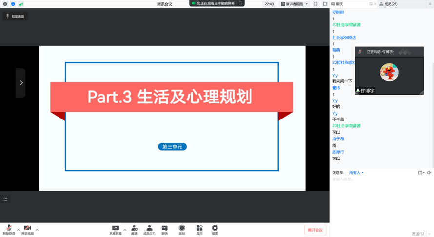 20级心理学班主题班会上陈嘉祁同学对班级同学的生活方面表示关心并表示极速飞艇
