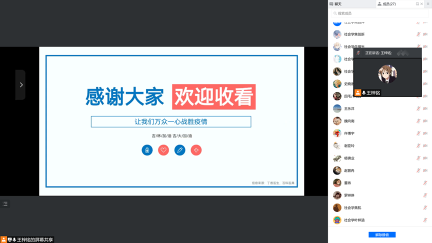 推出的各项活动,帮助同学们在课余时间解乏、解闷,并对同学们的学习情况以抗击疫情进行鼓励。最后,张林子琪同学给同学们总述了本学期的各项学习情况及期末的作业等,敦促同学们不要松懈学习,表达了战胜疫情的信心。