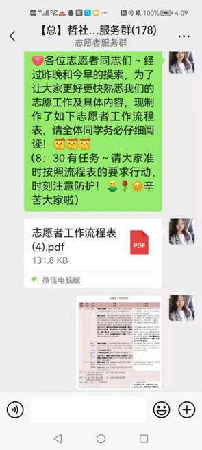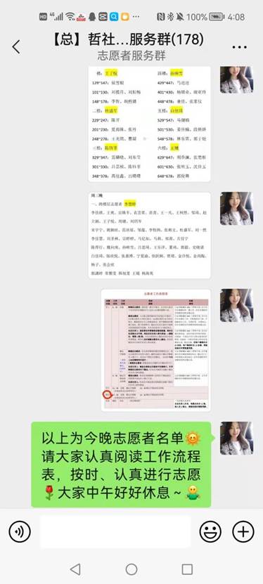 书记和老师们的领导下,南四哲社女生组建了100多人在内的志愿者服务群,我也开始全面负责志愿者们的所有工作,扛起了这面大旗。作为哲社女生负责人,我加入了南四负责人总群,开始全面对接南四的老师,并频繁和其他极速飞艇