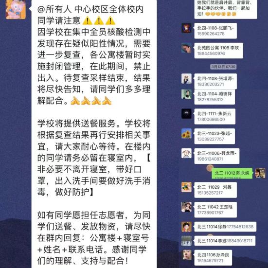 迅速采取了疫情防控紧急措施,各寝室楼实施封闭管理。招募志愿者的消息也随之下发,短短十分钟内,硕士生博士生9个公寓楼中,报名志愿者的研究生已近百人。他们中有即将走上高校讲台的博士研究生,有即将成为基层公务员的研三硕士生,有科研任务重、学生工作繁忙的研二学长学姐,还有身兼助研助管工作、但仍主动担任志愿者的研一硕士生。