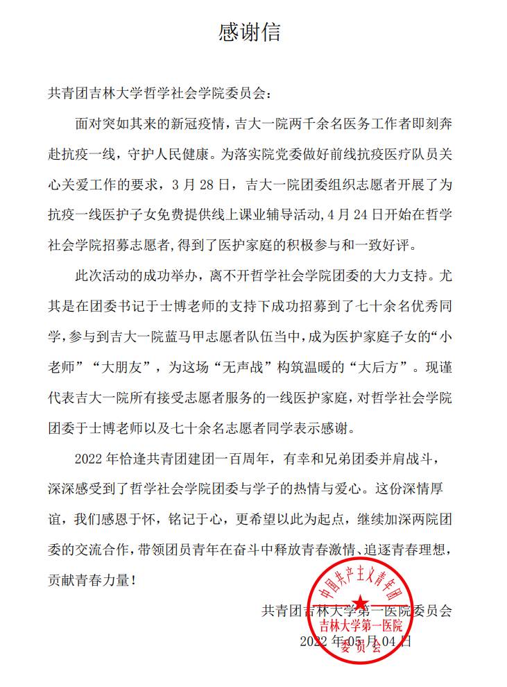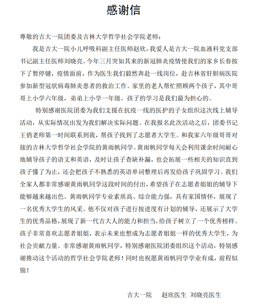 第一医院(以下简称“吉大一院”)团委和吉大一院赵医生、刘医生的感谢信。自疫情发生以来,吉大一院团委针对投身防疫一线的医务工作者子女开展线上课业辅导活动,极速飞艇