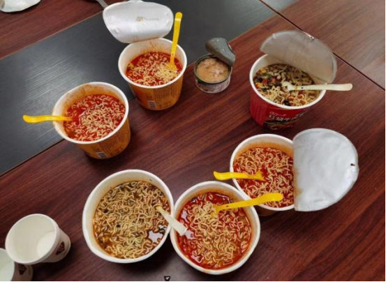 迎新工作组召开会议,召集志愿者,规划路线,制定人力等各方面资源分配的详细计划。时间紧任务重,加上大家完全投入到工作当中,使大家错过了用餐时间,但大家并不在意,而是用泡面、罐头做了代替。虽然食物平凡普通,但大家都全身心工作,乐在其中。