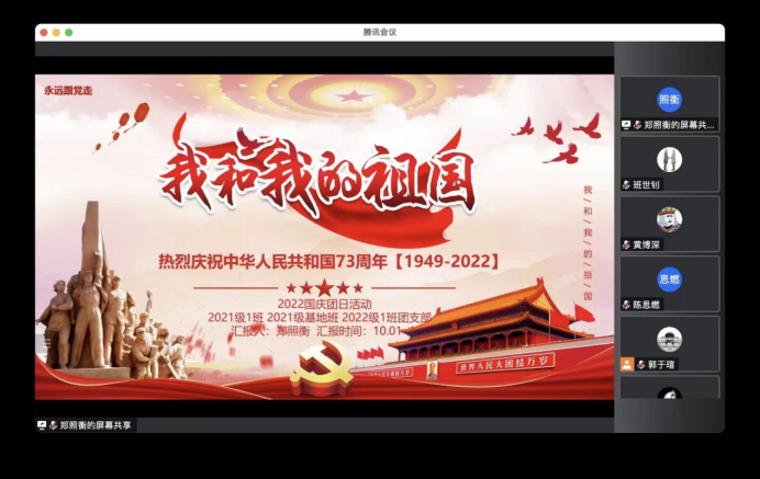 首先,各支部团支书组织同学们观看了有关国庆的视频,同学们在歌声与画面中体会着祖国73年的巨大变化,为一幕幕闪过的成就感到由衷地敬佩,为祖国的每一寸山河感到骄傲。同时,同学们表示,这承载着无数先辈心血的大好河山需要作为青年的我们拼尽全力去守护,才不愧对祖国和时代的期待。