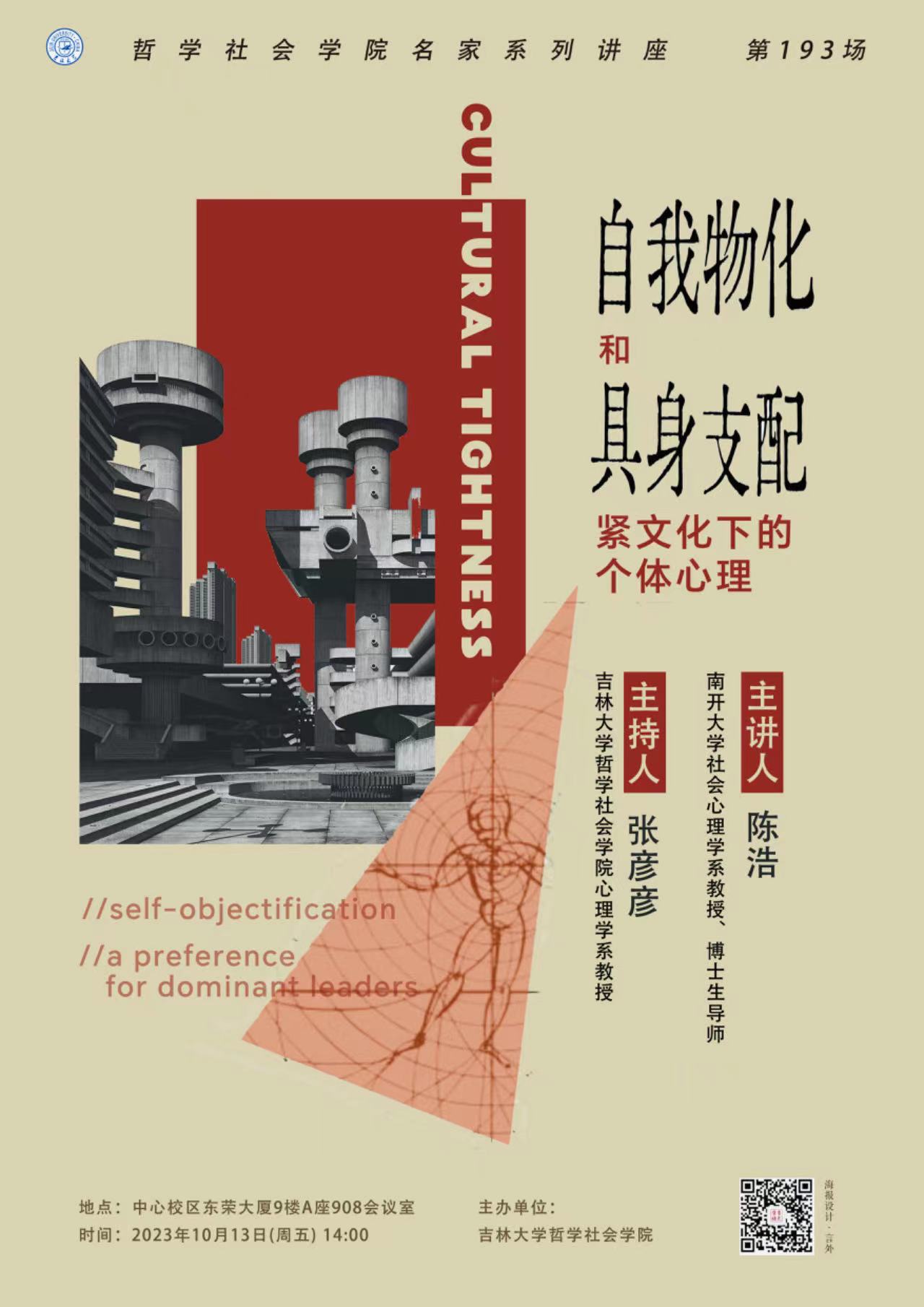 【极速飞艇 名家系列讲座第193场】陈浩:自我物化与具身支配:紧文化下的个体心理