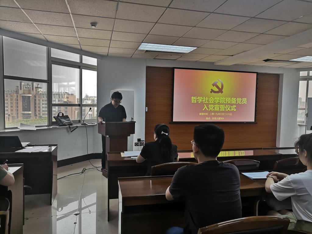 仪式在雄壮的《国际歌》中开始,张俊峰同志宣读参加入党宣誓的预备党员名单。在宣誓环节,由哲学系硕士崔光磊同志领誓,全体预备党员面向党旗进行了庄重的宣誓仪式。在场同志庄严肃穆,郑重许下为共产主义事业奋斗的承诺。