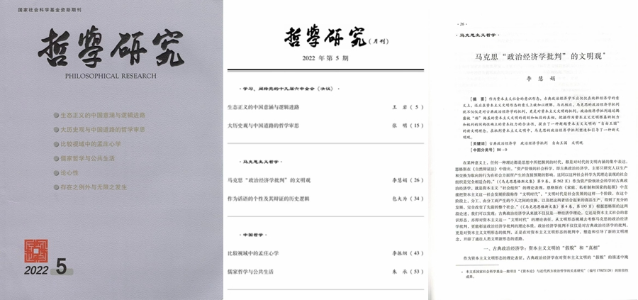 教授李慧娟在《哲学研究》2022年第5期发表文章《马克思“政治经济学批判”的文明观》,系统论证了马克思“政治经济学批判”塑造和引导了一种新文明观。