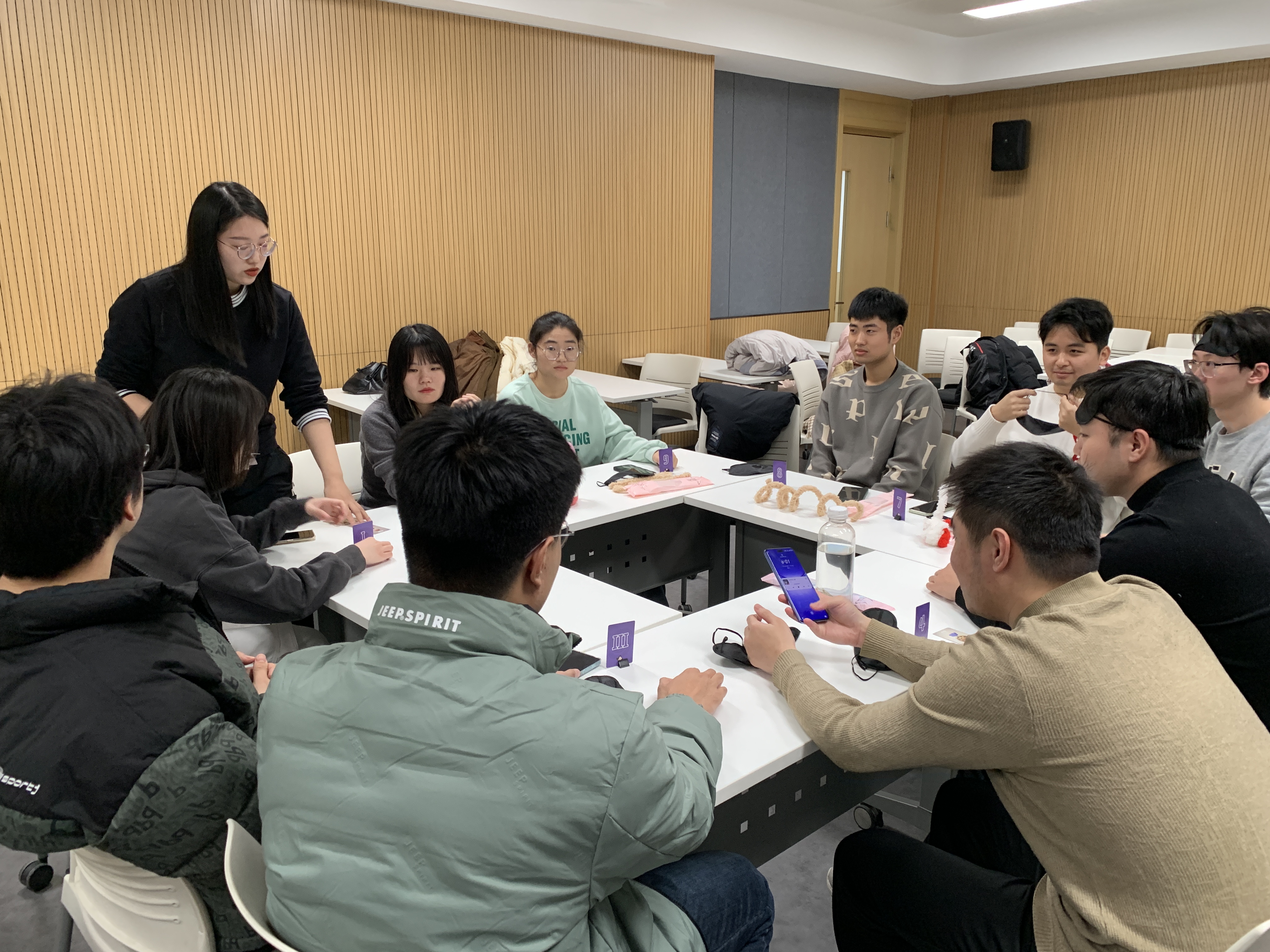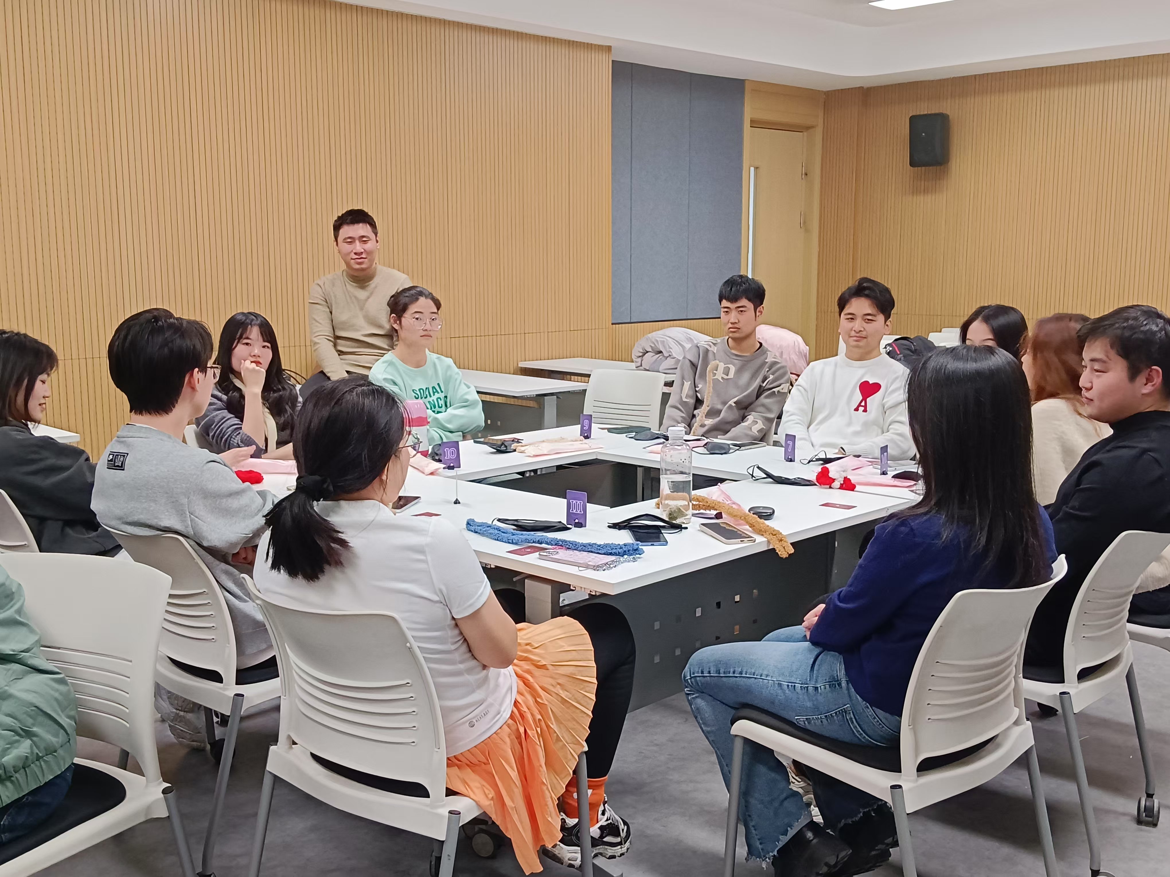 桌游区以狼人杀游戏为主,参与者们围绕游戏主题展开深入的交流与探讨。手工艺制作区的匠心独运,桌游区的智勇交锋,让参与活动的同学在欢声笑语中释放了焦虑和压力。