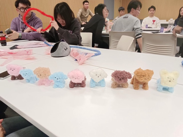 本次联谊活动分为手工区和桌游区。手工区以制作扭扭棒玩偶为主,旨在通过手工制作释放和调节同学们的焦虑情绪,达到疗愈心灵的效果。参与活动的同学们精心择取了各自心仪的手工材料,全神贯注地投入到手工艺品的创作中。期间,大家相互交流扭扭棒制作技艺,不仅有效促进了技艺的精进,更在无形中拉近了彼此之间的情感距离。每一件别出心裁的手工作品都凝聚着同学们的独特创意和鲜明的个人风格。