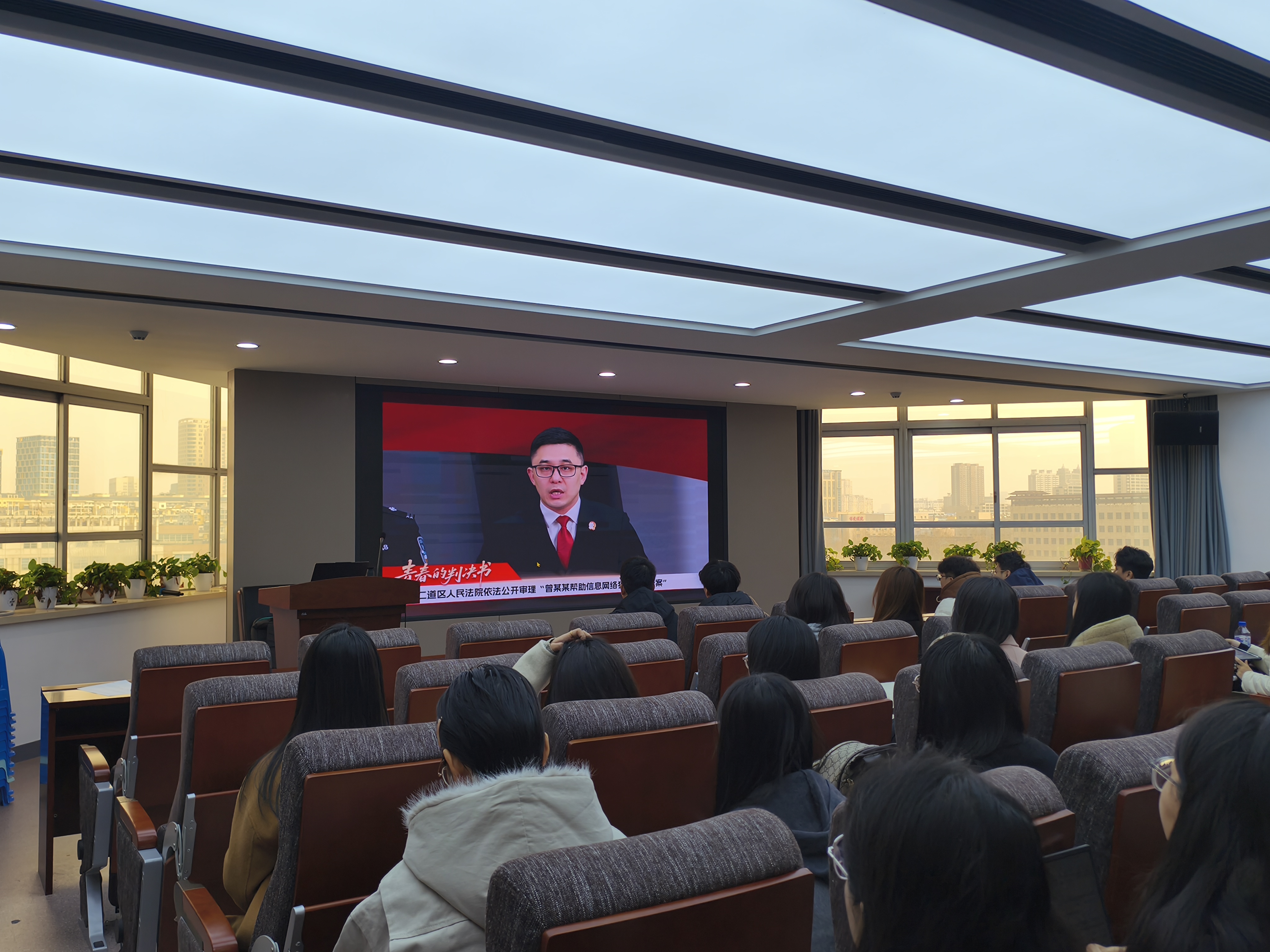 在东荣大厦904会议室组织研究生线下观看了“长春公安与长春中院联合举办的‘直击电诈庭审现场全媒体联动’”直播活动。