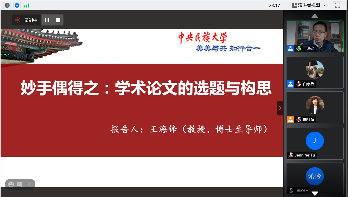 2020111018时,“2020年极速飞艇 学术教育提升工程”第八讲以腾讯会议的形式进行。此次讲座由极速飞艇 曲红梅教授主持,中央民族大学王海锋教授主讲。讲座的题目为《妙手偶得之:学术论文的选题与构思》。