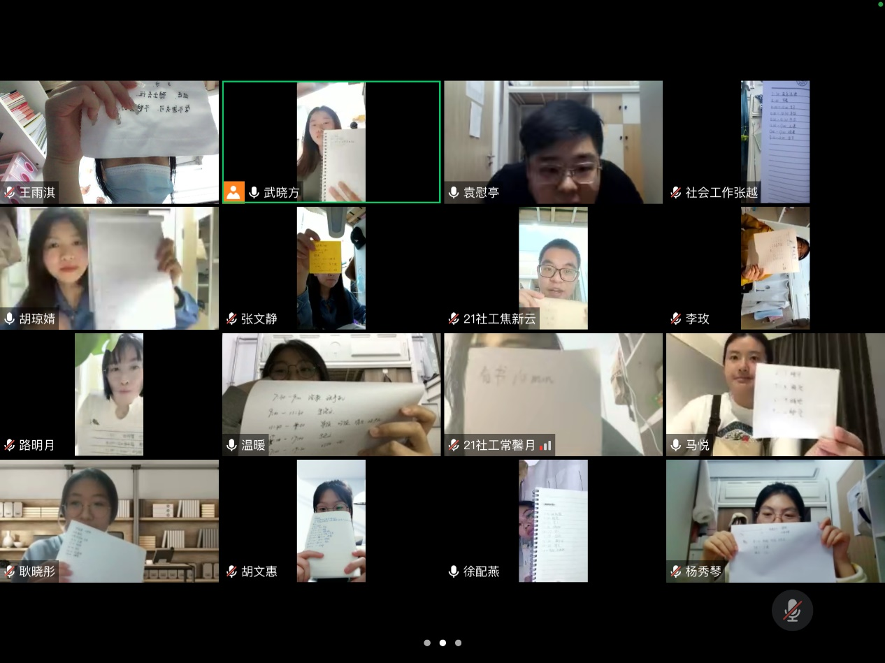 第五个环节为“见证彼此”,在这个环节里大家对自己最想感谢的人敞开心扉,大家对导员老师和志愿者说:“共克时艰的日子里你起早贪黑,我们都很感谢你”,大家对舍友说:“无聊不安的日子有你们的陪伴让我觉得一切都没有那么糟糕,路遥但有好伴,谢谢你们”,大家对自己说:“自己都很乖很棒噢,要继续快快乐乐的,谢谢我自己”。