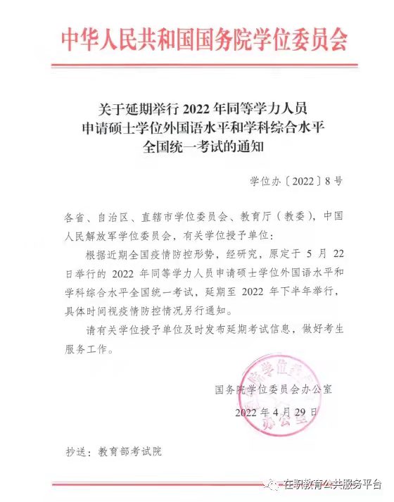 关于延期举行2022年同等学力人员申请硕士学位外语水平和学科综合水平全国统一考试的通知