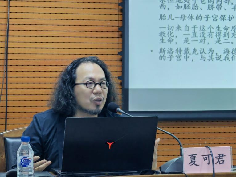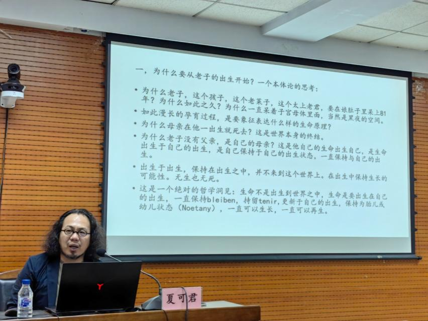 夏可君教授首先由“老子出生”的传说故事开始引入讲座主题。夏可君教授指出,汉学家施舟人与德国当代哲学家斯洛特戴克对这一故事都非常重视,斯洛特戴克在《球体学》第一卷“泡泡”的第四章,完整转述了这个故事并走向所谓“球体学”,而人类生命本质上是一种“生命在球体”,因此斯洛特戴克认为人类存在的一般理论应该采用球体学或“Innenraum理论”的形式
