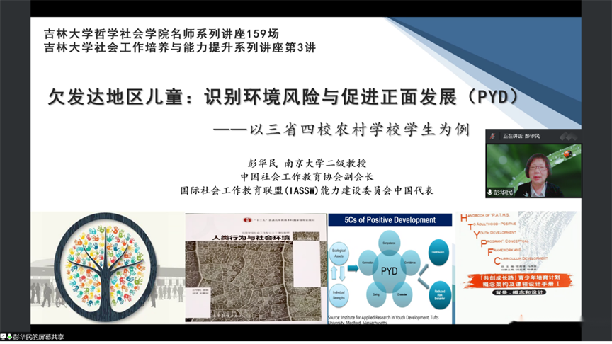 社会工作硕士培养与能力提升系列讲座”第3讲——《欠发达地区儿童:识别环境风险与促进正面发展(PYD)研究》,以线上会议的方式如期举行。该活动的协办单位为吉林省生命关怀协会医务社会工作及志愿服务专业委员会。本次讲座嘉宾是南京大学二级教授、博士生导师、社会建设与社工研究院院长彭华民老师,兼任教育部重大课题攻关项目首席专家、教育部马工程首席专家、第二届教育部全国MSW教指委委员、中国社会工作教育协会副会长、中国社会工作学会学术委员会副主任、中国社会学会社会福利研究专委会理事长、国际社会工作教育联盟(IASSW)能力建设委员会中国代表。本次讲座由副院长芦恒教授主持,院长田毅鹏教授及百余名师生线上参加了此次会议。