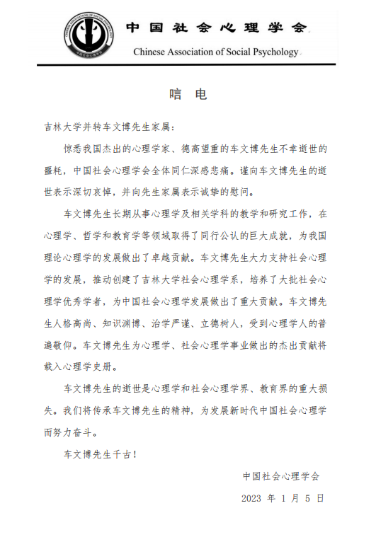 中国社会心理学会唁电