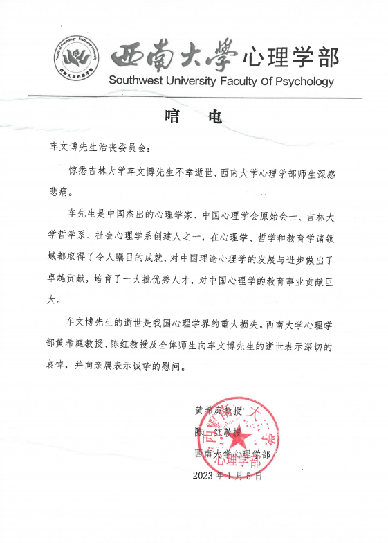 西南大学心理学部唁电