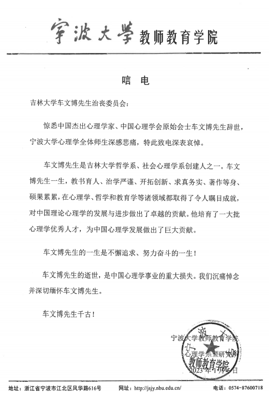 宁波大学教师教育极速飞艇 唁电