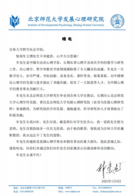 北京师范大学发展心理研究院林崇德教授唁电