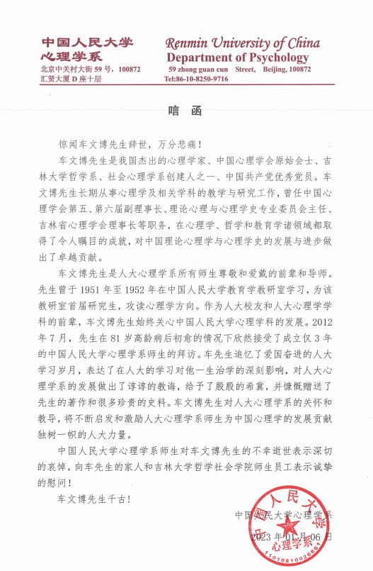 中国人民大学心理学系唁函