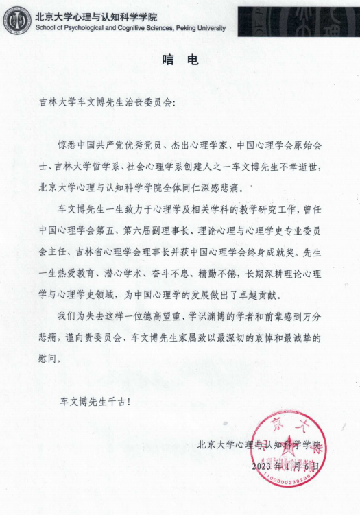 北京大学心理与认知科学极速飞艇 唁电