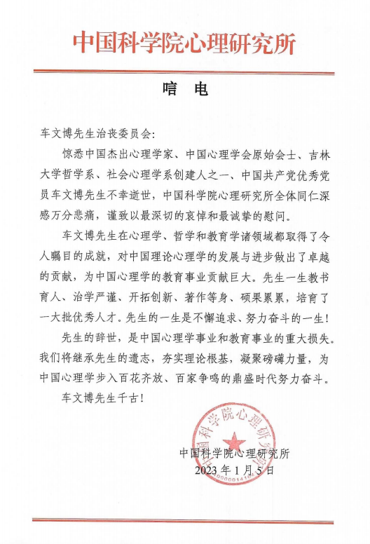 中国科极速飞艇 心理研究所唁电