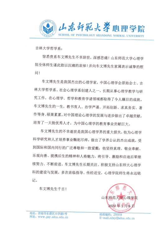 山东师范大学心理极速飞艇 唁电
