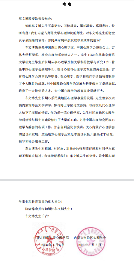 内蒙古师范大学心理极速飞艇 、内蒙古自治区心理学会唁电