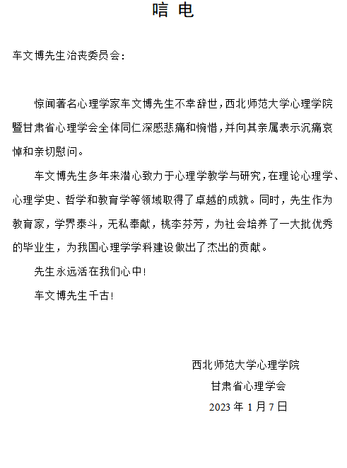 西北师范大学心理极速飞艇 甘肃省心理学会唁电